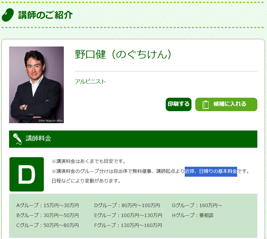 『講演会なび』では、野口健さんの講演会料は、近郊エリアの日帰りで1講演につき80~100万円なのだとか。